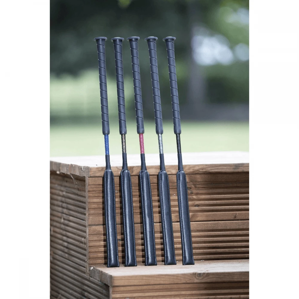 A stylish jumping and general purpose whip with kind, shock absorbing gel end pad covered with soft PU leather. A generous groved rubber grip handle offers great grip whatever the weather. The whip shaft is counter-balanced making it comfortable to hold and use.