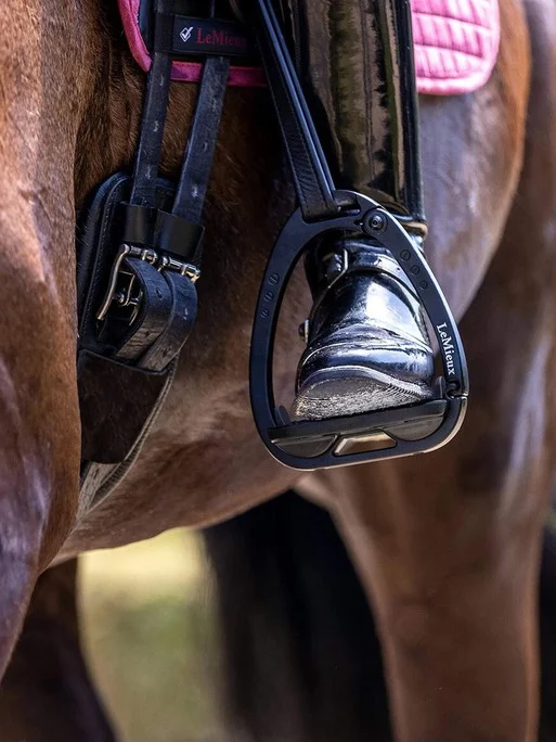 - An integrated hinged arm has a two-stage release system, preventing unintentional opening. The spring loaded arm locks into the base of the main frame meaning that when under maximum pressure, such as landing over a fence, the rider’s weight is spread evenly across the stirrup, preventing the outside dropping and flexing. When pressure is put onto the arm of the stirrup, the arm releases allowing the foot to come out of the stirrup and minimising the risk of it getting stuck. The stirrup arm breakout force = 36N (equivalent to 3.62kg) in testing meaning enough resistance to stop it opening unintentionally, but will release when needed.